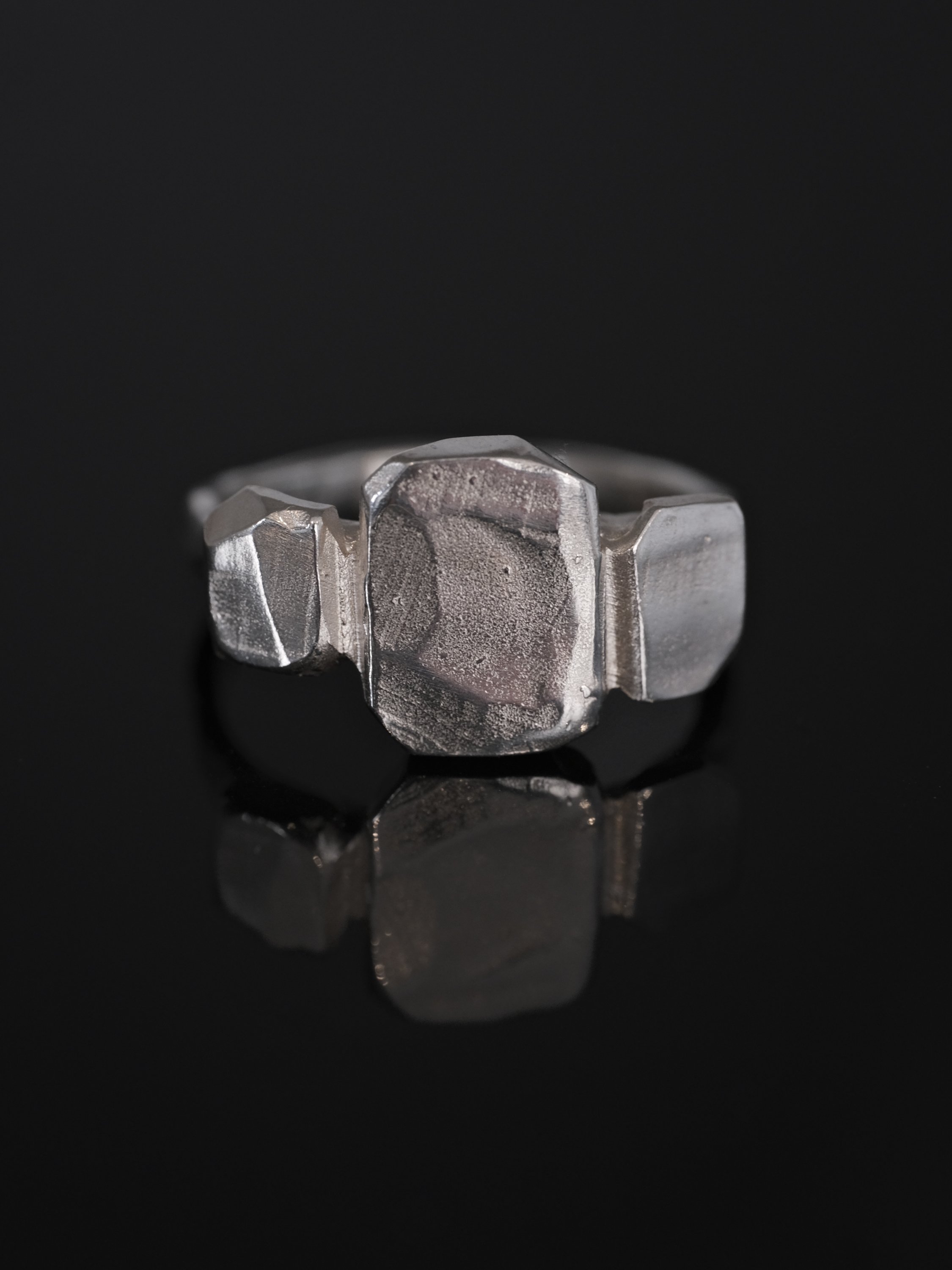 This ring is carved and faceted and cast in silver. I had intended to set three gems in each section but found beauty in how simple and strong the form is so left it as is.